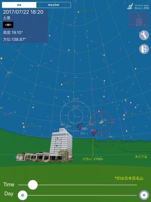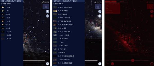 群馬県みなかみ町「水上高原ホテル200」から実際に眺められる星空と山並みが再現されています。初心者でも見つけ易い、月・木星・土星などの「惑星」検索から、玄人向けに星雲・星団・銀河などの「天体」検索の両方の本格的機能を備えています。