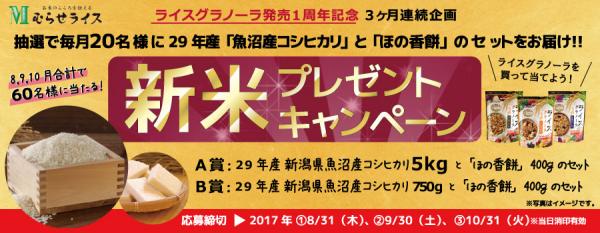 米穀の製造加工および販売を手掛ける、株式会社むらせ(本社:神奈川県横須賀市米が浜通1-6、代表取締役:村瀬 慶太郎)は、2017年7月26日(水)から28年連続特Aランク「新潟県魚沼産コシヒカリ」の新米(29年産)と山形庄内産もち米100%使用「ほの香餅」のセットが抽選で毎月20名様に当たる「新米プレゼントキャンペーン」を開始いたします。