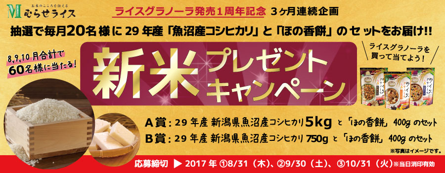 もうすぐ新米が美味しい季節!! 国産米100%のライスパフ使用「ライスグラノーラ」は2017年7月で発売1周年となりました。これを記念して、「ライスグラノーラ」対象商品のバーコードをハガキに貼って応募すると28年連続特Aランク獲得の新米「新潟県魚沼産コシヒカリ」&山形庄内産もち米100%「ほの香餅」400gのセットが抽選で毎月20名様に当たるクローズドキャンペーンを開始いたします。