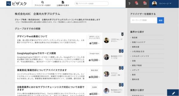 ビジネス相談ニーズに対して個人が対面や電話で相談に応える、スポット制のコンサルティングサービス「ビザスク」を提供。現役の役職員を中心に、企業OB、フリーコンサルタントなど40,000名超のアドバイザーが登録している。働き方改革、シェアリングエコノミーが着目される中で、組織・世代・地域を超えた新たな強みの活かし方を提案し、大手企業350社超において外部知見を活用したオープンイノベーションを推進している。2017年6月30日に、Creww株式会社、リンカーズ株式会社と共に「OPEN INNOVATION コンソーシアム」を設立。