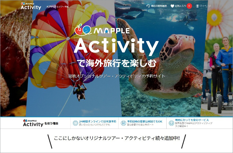 「MAPPLE Activity」(⇒https://www.mapple-tour.com/ )は旅ナカ(現地)でより旅を楽しむためのオプショナルツアー予約・販売代行サービスです。すべて日本語でのご案内で、現地のアクティビティ参加を安心サポートします。また今後世界各国でMAPPLEActivityデスクを開設してまいります。
