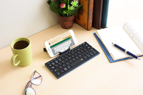 2つ折りでコンパクトに持ち運べるBluetoothキーボード。スリムタイプなので外出先での作業にも大変便利です。