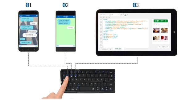 <マルチペアリング機能搭載 最大3台までBluetooth接続可能 「FN」+「切り替え」ボタンで簡単切り替え>