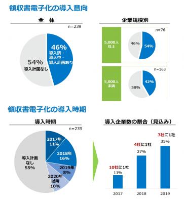 また、領収書電子化の導入時期を見ると、2017年が11%、2018年が16%、2019年が8%であり、2019年までには3社に1社が領収書電子化を導入すると見込まれます。