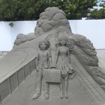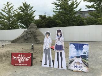 今年は、8月18日より公開されるアニメ映画『打ち上げ花火、下から見るか?横から見るか?』の公開記念コンテンツを実施。原作ドラマのロケ地が旭市と知られている今作の、ポスタービジュアルの砂像を制作・展示するほか、主人公の等身大パネルも設置、予告編も場内で上映し、当アニメ映画を応援しています。