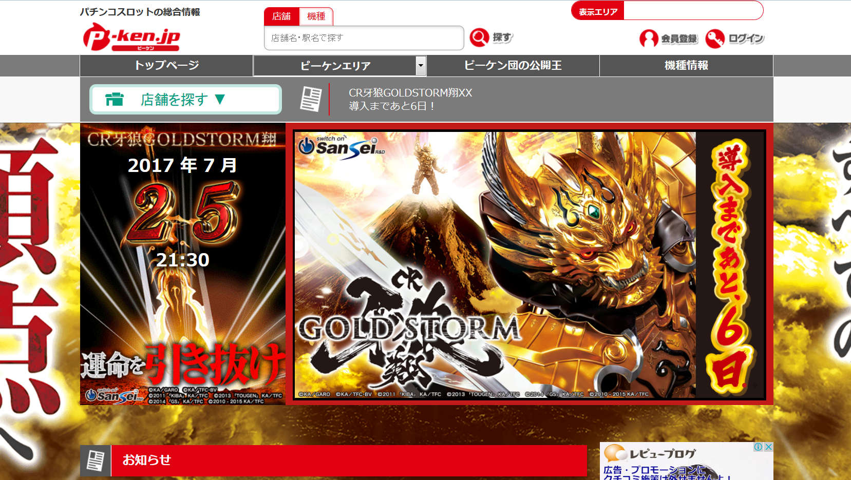 パチンコ・パチスロ情報サイトP-ken.jp(ピーケンドットジェイピー:株式会社SANN運営)は、2017年7月31日より順次全国導入開始予定のCR牙狼GOLDSTORM翔(株式会社サンセイアールアンドディ)とのコラボレーションを実施します。期間中はP-ken.jpを華やかな牙狼デザインでジャック。CR牙狼GOLDSTORM翔の導入予定日からP-ken.jp独自の実践値データやピックアップデータも特集記事内で毎日更新。