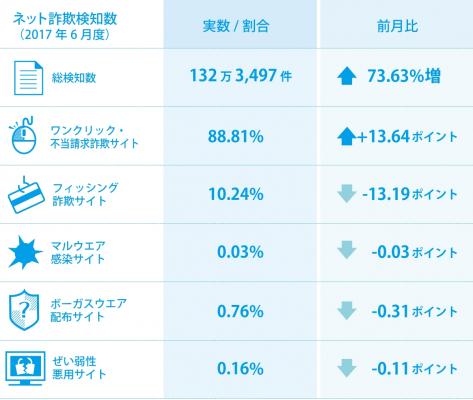 BBソフトサービス(BBSS)の「Internet SagiWallTM(インターネットサギウォール)」で検知したデータを基にした、2017年6月度のインターネット詐欺リポートです。