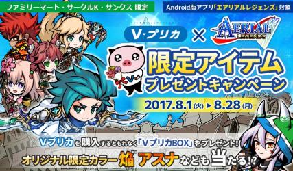 2017年8月1日(火)より、『Vプリカ』×『エアリアルレジェンズ』の限定アイテムプレゼントキャンペーンを実施いたします。本キャンペーンでは、全国のファミリーマート・サークルK・サンクスに設置されているFamiポートやKステーションでVプリカをご購入毎にゲーム内アイテム(VプリカBOX)と交換できる「シリアルコード」を発行いたします。(一部設置されていない店舗がございます) 「シリアルコード」は指定の方法にてGooglePlay(Android端末)のみで「VプリカBOX」に交換することができます。アイテムがもらえるお得なキャンペーンとなっておりますので、この機会をお見逃しなく!