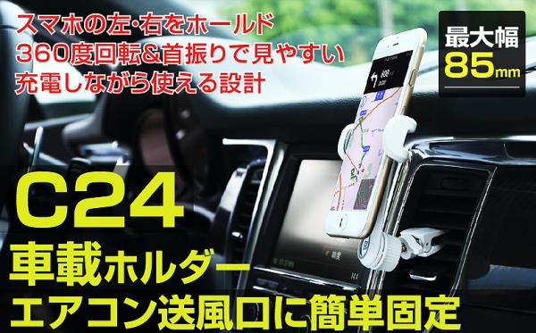「C24」はエアコン送風口に工具不要で取り付けできるスマートフォン用ホルダーです。幅5cm~8.5cmまでのスマホに対応し、iPhone 7Plusまでの大きいスマホをアームとスタンドで固定します。スマホを装着したまま操作や充電ケーブルを接続できます。日本語パッケージなので安心してお買い求めできます。