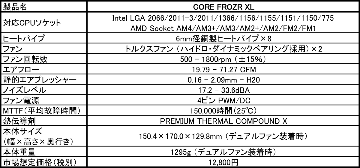 本製品では、トルクスファンのもう一つの特徴である静音性を高めるべく、長時間の動作でも安定したファン駆動を実現するため、付属の120mmファンのベアリングにハイドロ・ダイナミックベアリングを採用しています。CPUソケットは、Intel Core Xシリーズに対応するLGA2066に加え、LGA 2011-3/2011/1366/1156/1155/1151/1150/775、AMD Ryzenシリーズに対応するSocket AM4およびAM3+/ AM3/AM2+/AM2/FM2/FM1をサポートします。本体サイズは2基のトルクスファン装着時で150.4×170.0×129.8(幅×高さ×奥行き)mm。トルクスファンの装着位置を調整することで、マザーボードとファンの間に最大55mmの空間を確保することができ、大型ヒートシンクを装着したハイエンドメモリにも対応可能です。