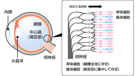 夜間にブルーライトを見ると、寝つきが悪くなると言われています。眼の奥にある網膜には、錐体細胞(かんたいさいぼう)と桿体細胞(すいたいさいぼう)の2種類の視細胞があります。錐体細胞は色に敏感で、桿体細胞は明るさに敏感です。桿体細胞は脳の組織「松果体」に明るさを伝え、その情報を基に松果体はメラトニンというホルモンを分泌します。