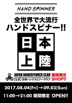日本ハンドスピナークラブ(株式会社ケースオクロック 本社:東京都渋谷区、代表:山本智也)は、ヴィーナスフォート:1階共有部にて期間限定のポップアップショップをオープンします。(期間:2017年8月4日(金)~2017年9月3日(日)11時~21時)