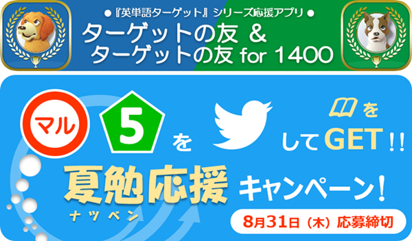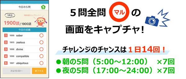 本キャンペーンでは、アプリ「ターゲットの友」・「ターゲットの友 for 1400」の機能「今日の5問」で、出題される英単語テスト5問全てに正解することが、応募条件の1ステップとなります。