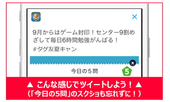 (3)Twitterハッシュタグ(#タゲ友夏キャン)を付けたツイートに、撮影したスクリーンショットを貼り付け、秋からの受験勉強への意気込み・決意コメントを入力して投稿する。