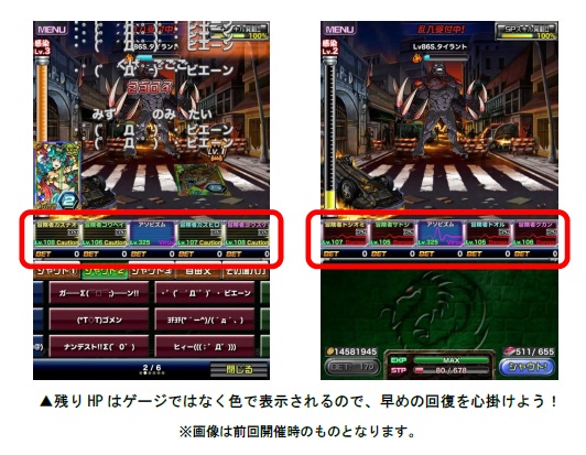 今回の同時開催される2つのスペシャルダンジョンでは、HPゲージが「心電図」のような表示に変わります。残りHPの状況が色で表示されますので、ゲームオーバーに注意しながらクリアを目指しましょう!