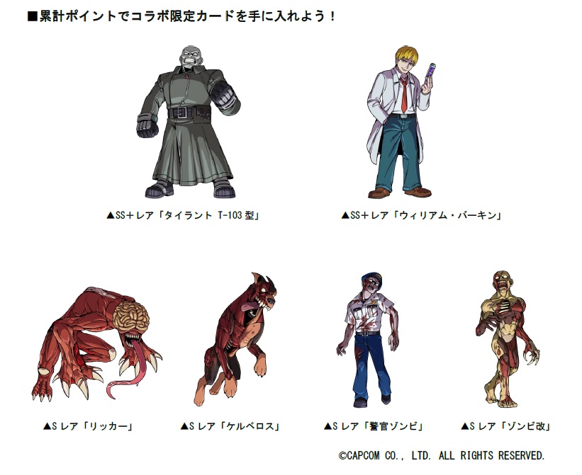 過去2回のコラボで登場した『バイオハザード』シリーズおなじみの歴代キャラクターたちが全員再登場!また、コラボ限定の衣装をまとうドラゴンポーカーのキャラクター「魔法少女ラン」と「ベルモット」も復刻登場致します!