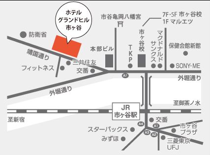 JR、東京メトロ、都営新宿線の市ヶ谷駅から徒歩3分JR総武線でお越しの方は新宿よりの階段を上った改札口をご利用ください。