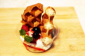 この商品は、独自のノウハウで焼き上げたワッフルと、とろとろチーズをたっぷりかけたアイスを一緒に楽しめる贅沢パフェです。
