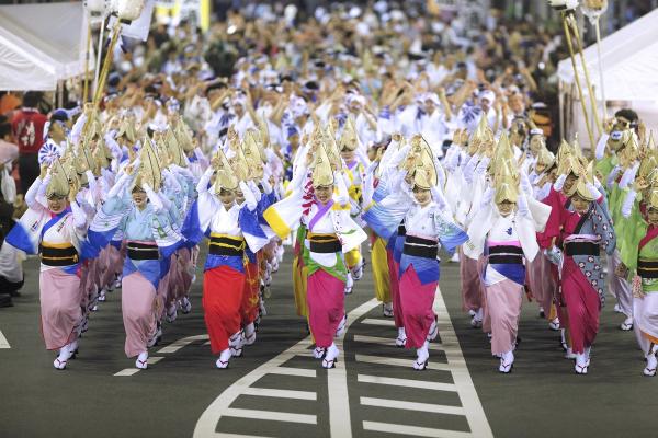深編笠に揃いの浴衣で練り歩く女踊り。腰を落とし、地を這うように暴れ踊る男踊り。そして三味線や太鼓、鉦(かね)に代表される鳴り物。これら3つのグループで構成され、道路を練り歩く“流し踊り”や、ステージでフォーメーションを変えながら踊る“舞台踊り”“組踊り”が繰り広げられます。舞台踊りでは、各連が音楽や照明にも工夫を凝らし、その各々の特徴も含め、見どころ満載です。