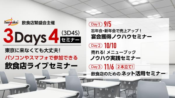 そこで、当社は、国内最大級のセミナーサイト「ビジネスクラス・セミナー(http://www.bc-seminar.jp/)」を運営する株式会社ファシオと提携し、同社が提供するイベントプラットフォーム「Deliveru(デリバル)」を活用し、「忘年会対策セミナー(9/5)」・「メニューブックノウハウセミナー(10/10)」・「飲食店ネット活用セミナー2本立て(11/6)」の合計4セミナー『3Days4Seminer(3D4S)』をインターネットで生中継し、全国飲食店の経営者やスタッフが自社のパソコンやスマートフォンで受講できるライブセミナーを開催いたします。