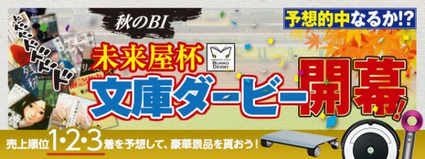 イオングループの株式会社未来屋書店(本社:千葉市美浜区、代表取締役社長:羽牟秀幸、以下 未来屋書店)は、文庫本の売上順位を予想するお客さま参加型のオリジナルキャンペーン『秋のB1 未来屋杯 文庫ダービー』を開催中です。