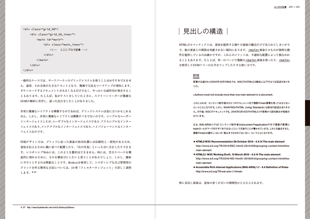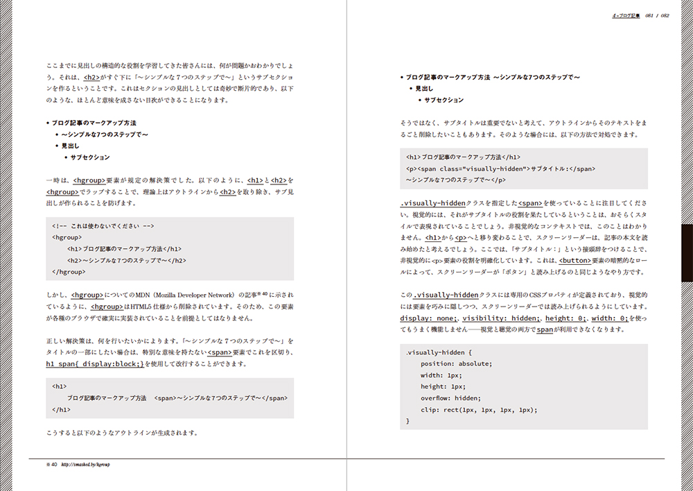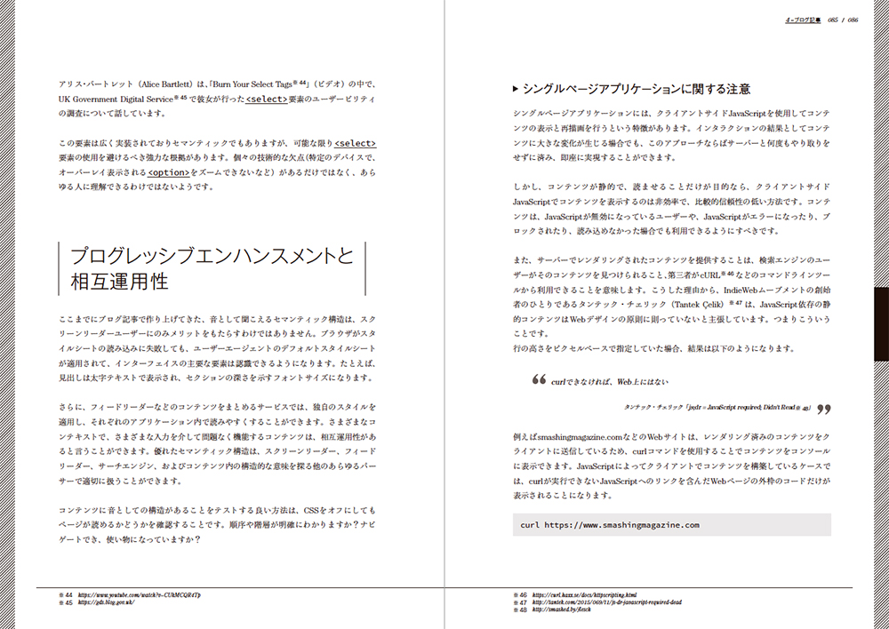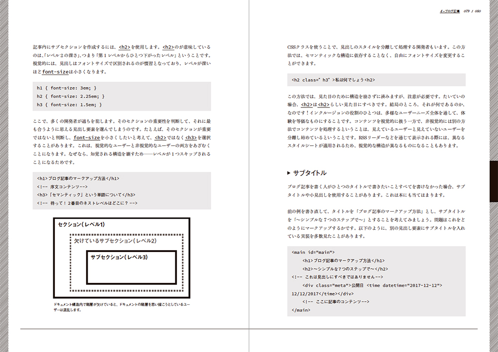 HTMLやCSSに関する類書にはレイアウトなどの見た目を実現するためのHTMLやCSSのパターン集が多い中、本書はWebの本質に立った、「あらゆる環境やユーザーにとって使える(つまり除外しない)」WebサイトやWebアプリケーションの実装のアプローチ方法について解説しています。