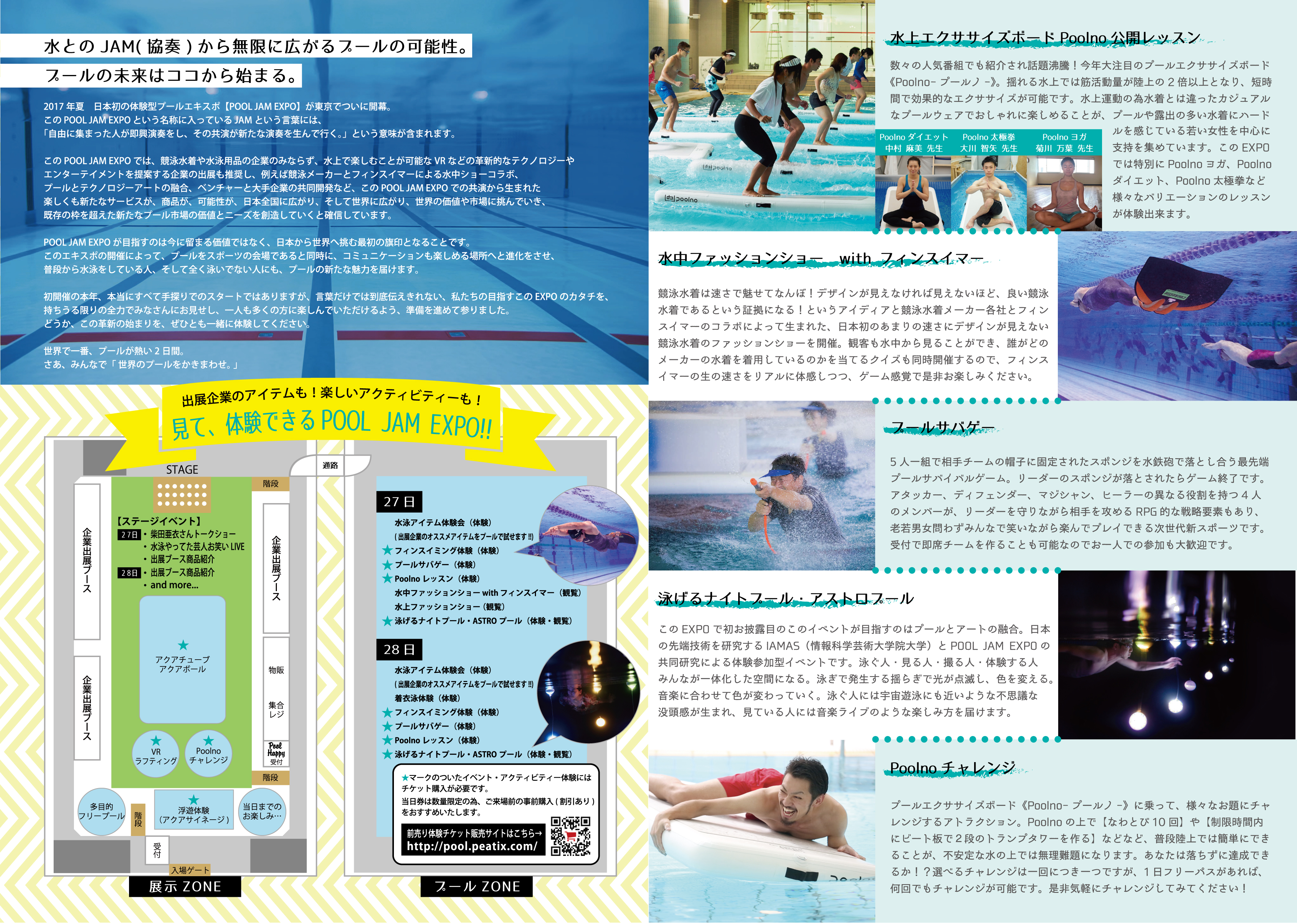 日本のみならず世界中からスポーツに注目が集まる東京オリンピックが開催されます。その盛り上がりが最高潮に達する 2020年までに、様々な水泳大会の隣で「POOL JAM EXPO」の開催を計画しています。プール から生まれる新しい商品やサービスに人々の関心を集め、話題を喚起することて?市場の活性化を目指します。 業界の垣根を超えた JAM(融合)、「POOL JAM EXPO」の第一回に、是非ご期待ください。