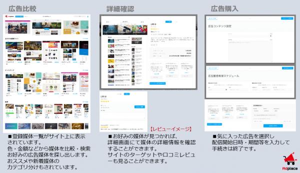 『Adplace』とは、商材に合った媒体の広告枠を選んで購入し、さらに、媒体に掲載するまでの工程を一貫して行う事の出来る日本初の広告枠のショッピングサイトです。