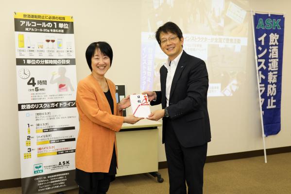 贈呈式は、同団体の事務所にて目録を贈呈し、寄付金の使途を中心に一年間の活動をご報告いただきました。同団体は飲酒運転を切り口に、社会にアルコールの正しい知識を広めたいという思いから、飲酒運転防止インストラクター養成講座やグッズを用いた予防活動などを通して、アルコール問題に精力的に取り組んでいます。今回のムジコロジー・スマイル基金の寄付金は、前回に引き続き同団体の「飲酒運転防止プロジェクト」に使われます。