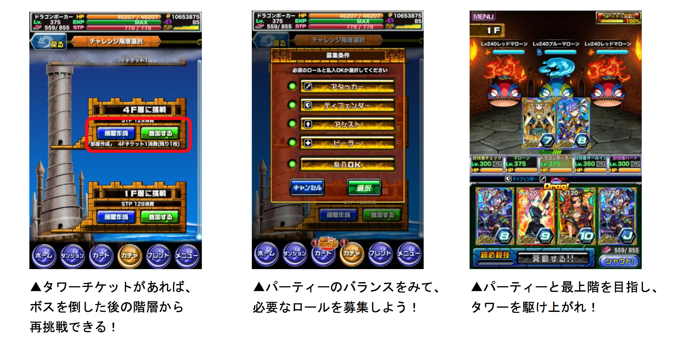 タワーダンジョンには「部屋作成」または、部屋に「参加する」を選択して挑みます。部屋を作成する場合、パーティーに入って欲しいロール(役割)を選択して、メンバーを募集することができます。ロールの異なるメンバーで役割分担しながら、ボスに挑んでみましょう!また、4階層以上で部屋を作成する場合、一定階層ごとに出現するボスを倒した際に手に入る「タワーチケット」を1枚消費することで、ゲームオーバーや中断した場合でも、チケットを手に入れた階層から挑戦できます。