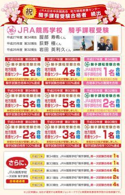 難関の騎手課程受験・騎手試験、本校設立以来7年間で25名の騎手課程受験合格者を輩出騎手という職業は、競走馬を扱う仕事の中でも、一番スポットが当たる人気の職業であり、近年、競走馬を取り巻く競馬のブームは、小学生・中学生からの若者にまで影響しており、また、近年の女性騎手の活躍で、『ジョッキーになりたい』『騎手になりたい』と思う若者が性別に関係なく、急増し、JRA競馬学校の騎手課程受験者は馬のブームは、小学生・中学生からの若者にまで影響しており、また、近年の女性騎手の活躍で、『ジョッキーになりたい』『騎手になりたい』と思う若者が性別に関係なく、急増し、JRA競馬学校の騎手課程受験者は年々傾向にあるといわれています。