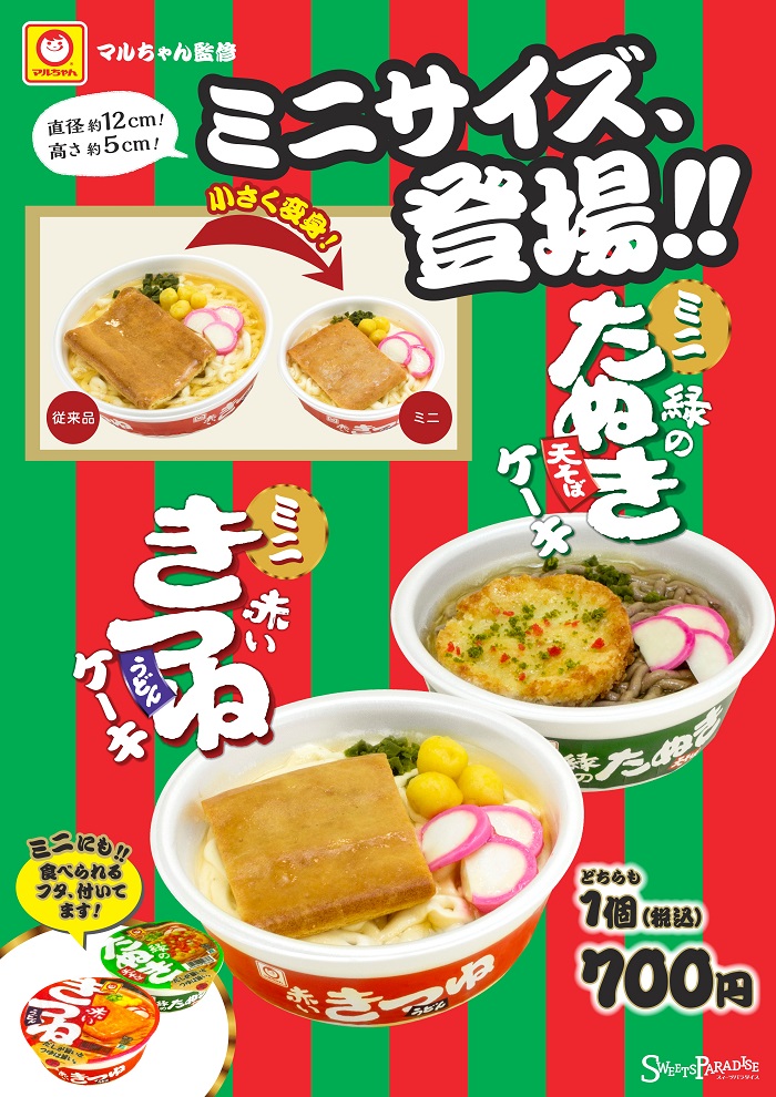 井上商事株式会社(本社:大阪市北区 代表取締役:井上敬策)は、2017年8月19日(土)から、スイーツパラダイスケーキショップにて、東洋水産株式会社(本社:東京都港区 代表取締役:今村将也)監修のもと、「赤いきつね 緑のたぬきケーキ」のミニサイズ版を販売することになりました。大好評販売中のコラボケーキのミニサイズ版となります。スイーツパラダイスケーキショップ催事会場、ECサイトでも展開を予定しております。