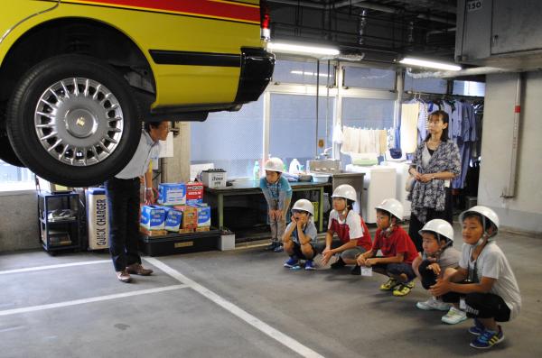 墨田営業所には、施設内に車両点検をする工場があります。ここでは普段、当社のタクシーやハイヤーの点検が行われます。参加者たちはなかなか見ることができない車両の下をのぞき、工場長よりどんな作業をしているか聞きました。タクシーとは、乗務員の他これらプロのスタッフがお客様の「安全・安心」を支えていることを学びました。