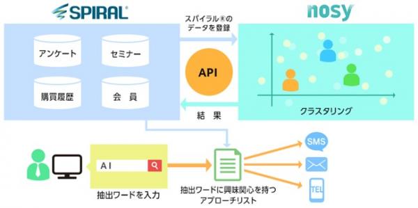 本ソリューションは、マーケティングサイクルを最適化するクラスタリングオートメーションツール「nosy」と、CRM機能を兼ね備えたメール配信システム「スパイラル(R)」を連携することにより、AIによるデータ分析で届ける情報にマッチする顧客層を自動で抽出し、データが少ない消費者に対しても一人一人に最適なアプローチをすることが可能となります。