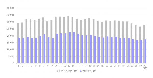 日次のアクセスホスト数、攻撃ホスト数の推移です。