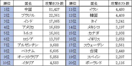 ※注:上記は単純な攻撃ホスト数のカウントであり正規化を行なっていないため、人口やインターネット利用者数が多い国が上位にきている点に注意が必要です。