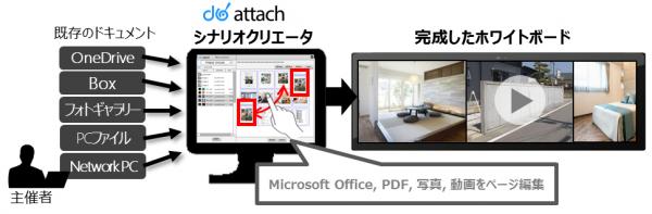 『do!attach』は、“シナリオクリエータ機能”に、ファイルフォーマットが異なる複数の資料(Excel、Word、PowerPoint、PDF、MP4、JPEG)が登録でき、登録した各資料内の使用したいページを選択し、選択したページを自由に並べ替えてオリジナルのプレゼンテーション資料であるシナリオを作成できます。完成したシナリオを利用してプレゼンテーションを実施、ペンやスタンプでお客様の反応や情報の内容を書込むことで、すべてのプレゼンテーション履歴が記録され、その場でシナリオをPDFとして出力してお客様にご提供できます。