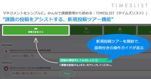 「課題管理でマネジメントをシンプルに ”はたらく”を変えていく、”できること”が増えていく」環境作りのため、体系的なマネジメントの考え方・現場と並走する実践の支援・使いやすいツールの3つを組み合わせて提供する株式会社マネジメント(本社:東京都港区、代表:音羽真東)は、 使いながら生産性を確実に上げられる課題管理ツール「TIMESLIST(タイムズリスト)」に、”課題の投稿をアシストする、新規投稿ツアー機能”を2017年9月1日より提供開始しました。