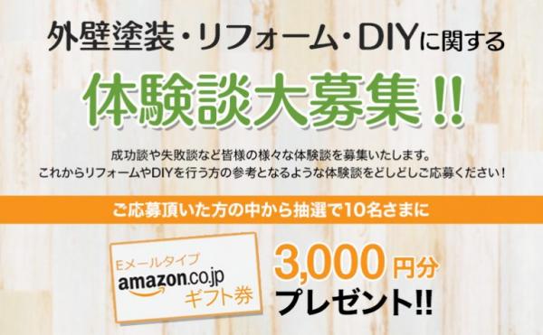 お家の外壁塗装・リフォーム工事・DIYに関する体験談であればどなたでもご応募でき、ご応募いただいた方の中から抽選で10名様に3,000円分の商品券を贈呈いたします。