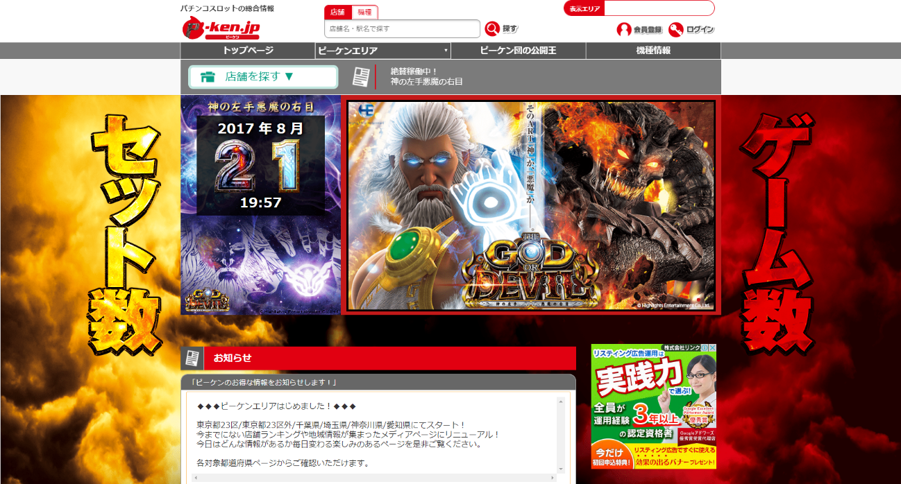 パチンコ・パチスロ情報サイトP-ken.jp(ピーケンドットジェイピー:株式会社SANN運営)は、2017年8月21日より順次全国導入開始予定の神の左手悪魔の右目(ハイライツ・エンタテインメント株式会社)とのコラボレーションを実施します。期間中はP-ken.jpを神と悪魔がジャック。神の左手悪魔の右目の導入予定日からP-ken.jp独自の実践値データやピックアップデータも特集記事内で毎日更新。また特集ページではピーケン全体での大当たり総回数を表示する神悪メーター等、情報盛りだくさんでユーザーをお出迎え!