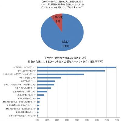 佐田が20代30代女性500人にとったアンケート結果では、91%の女性が「スーツが原因で印象を台無しにしている男性を見ますか?」との質問に、「YES」と答えました。どんなスーツが印象を台無しにするかとの問いに対しては、「サイズが大きく、ダボダボのスーツ」が、「古くてくたびれたスーツ」を上回り、ダントツの1位にランクインしました。もっと上位に来ると思われた、「デザインが古臭い」「生地が安っぽい」は高いシェアを占めておりません。このアンケート結果から考えますと、「斬新なデザイン」「高級な生地」の「サイズが大きく、ダボダボのスーツ」を着ている方は、ピエロということになってしまいます。