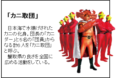 日本海で水揚げされたカニの化身。団長の「カニダー」と5名の「団員」からなる計6人を「カニ取団」と呼ぶ。