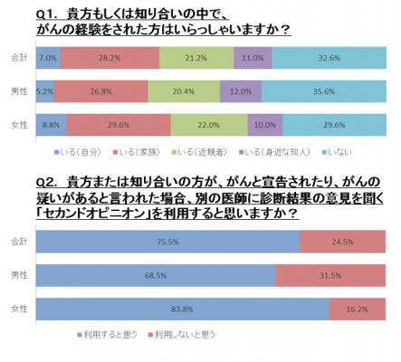 ◇本人または知り合いにがん経験者がいないという人の8割近く(75.5%)が、セカンドオピニオンを「利用すると思う」と回答。さらに男性より女性の方が、セカンドオピニオンの受診に積極的な傾向。