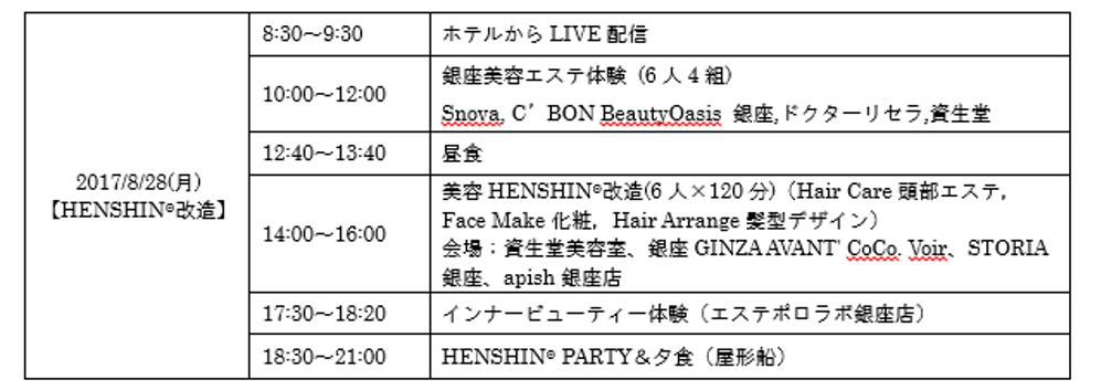 ツアー4日目の2017年8月28日「“HENSHI(R) 改造”」と称した美容の体験ツアーは、午前中に銀座のエステサロン(ドクターリセラ・C’BON・Snova・資生堂)でフェイシャルエステを体験致しました。