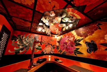 外国の方が思い描いている江戸時代の日本の遊郭的な、映画『さくらん』をイメージし、朱色と金、花と蝶のデザインで仕上げました。店内には花をふんだんに取り入れ、春は桜、秋になれば紅葉など日本にしかない四季の移り変わりを演出しております。店内小物類、スタッフも和姿で迎えるなど全て「和」をコンセプトとし、他にはない店内へのこだわりを持っております。
