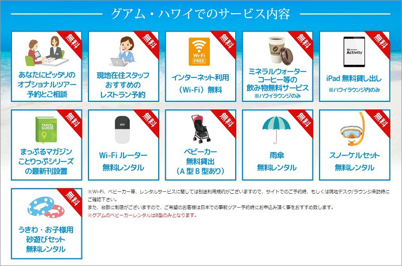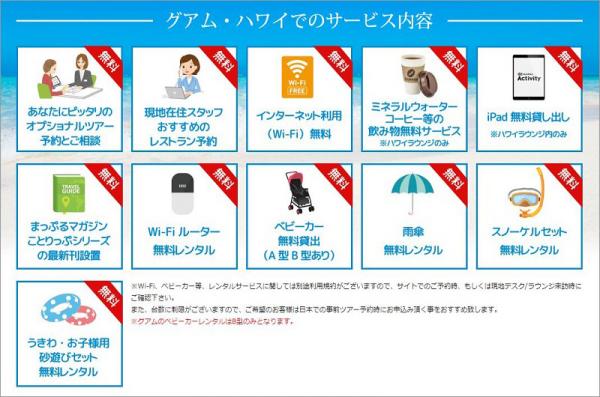 「昭文社発行のグアム・ハワイ関連誌をお持ちの方」「MAPPLE Activityでツアー予約をされた方」「デスク・ラウンジでツアー予約をされる予定の方」を対象に様々な無料サービスをご用意しております。