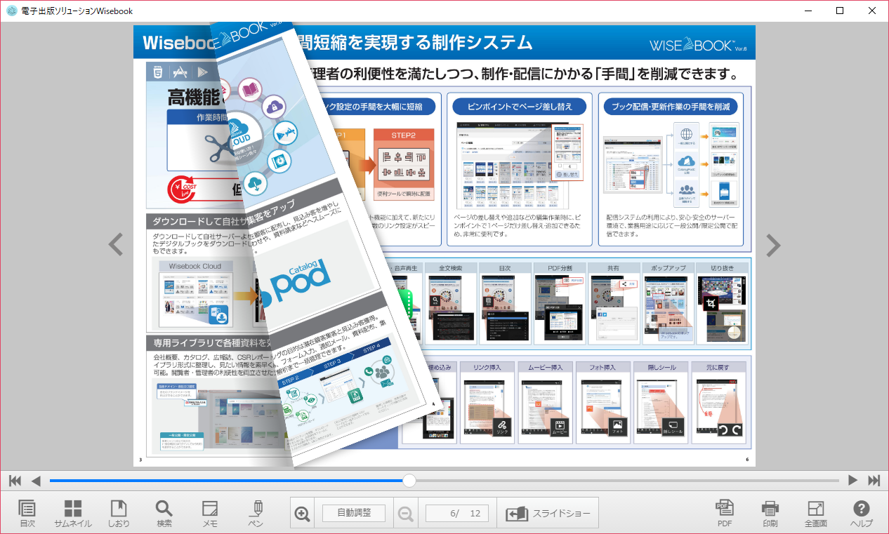 Adobe社の「FLASH」開発停止にいち早く対応。Wisebook 6の新機能としてオフライン環境のPCから閲覧が可能な専用ビューアを標準提供。電子カタログをCD-ROMとして配布することで、オフライン環境のPCからFLASHを使うことなく閲覧可能。電子カタログ利用をよりセキュアに、より快適に実現。
