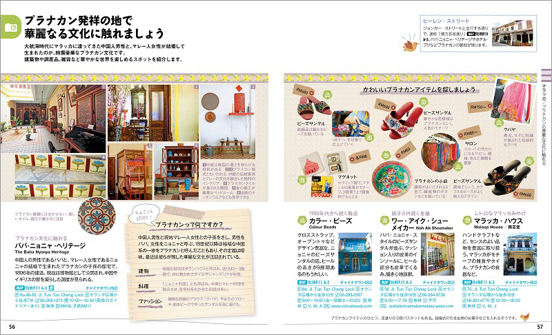 ここではそうした背景を持つ多彩な歴史建造物や、中国とマレーの文化が融合した絢爛なプラナカン雑貨、伝統的なニョニャ料理の数々をご紹介しています。