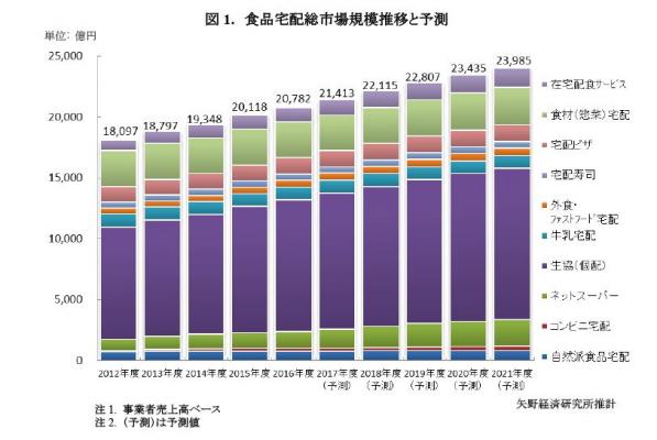 本調査における食品宅配市場とは、(1)在宅配食サービス、(2)食材(惣菜)宅配、(3)宅配ピザ、(4)宅配寿司、(5)外食チェーン・ファストフード宅配、(6)牛乳宅配、(7)生協の個配サービス、(8)ネットスーパー、(9)コンビニエンスストア(コンビニ)宅配、(10)自然派食品宅配を対象とする。但し、いずれの宅配サービスにおいても日用品、雑貨を除く食品群を対象とする。