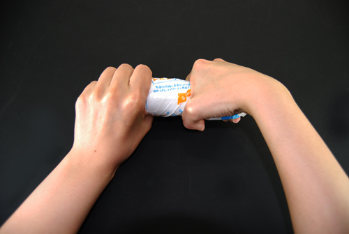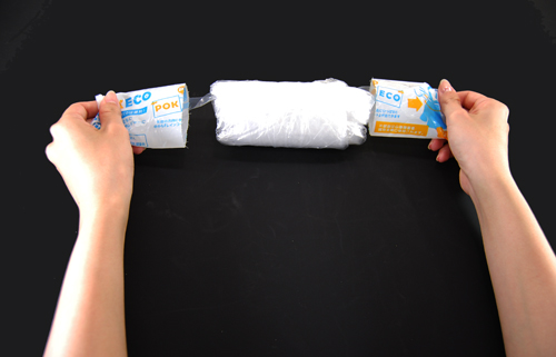 「いきなりレインコート」は、開封前は縦170mm×横45mm×奥45mmと飲食店などで出てくる布製おしぼりと同程度のサイズ で、小さく収納されています。包装を両手で軽く引っ張れば、レインコートに早変わり。製造時における、この商品の最終工程では簡単に真似のできない技術を活用しています。